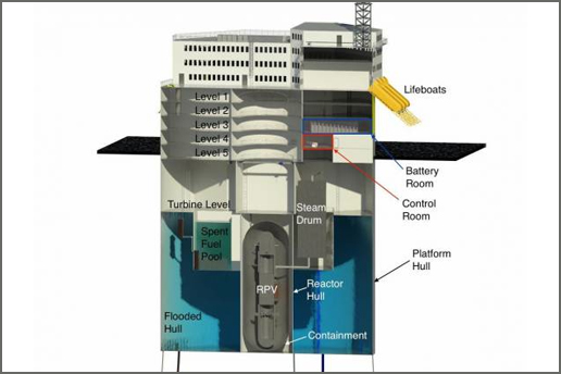 這一構(gòu)想的平臺可以在船塢中建造,然后拖曳到距離海岸幾海里的較深海區(qū)。它可以通過海底電纜與電網(wǎng)相接。這種平臺可以避開地震,還能承受海嘯打擊。其設(shè)計結(jié)構(gòu)能帶來足夠的安全性。特別是散熱器浸入海洋可以保證反應(yīng)堆制冷的穩(wěn)定可靠,并能避免外部干擾。