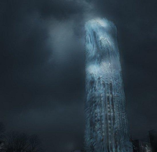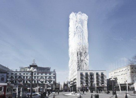 藝術家描繪的瑞典首都“多毛摩天大樓”,這種多毛結構事實上是纖細的纖維體,隨風飄動可將風能轉化為電能