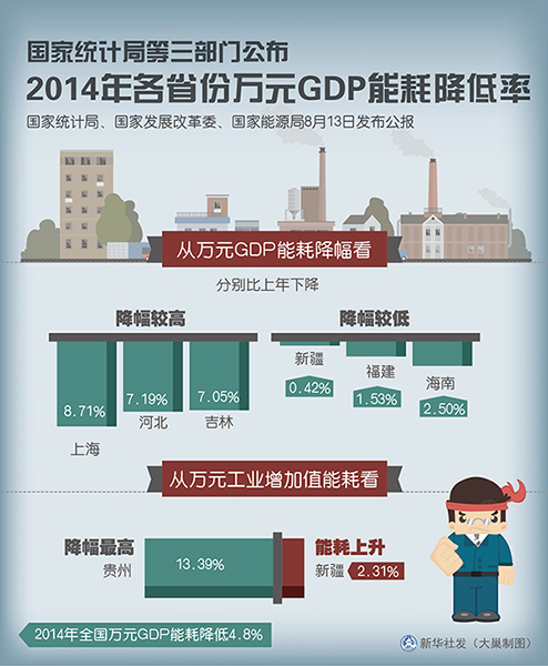國家統計局、國家發展改革委、國家能源局13日發布公報,公布了2014年各省區市萬元地區生產總值(GDP)能耗降低率等指標。