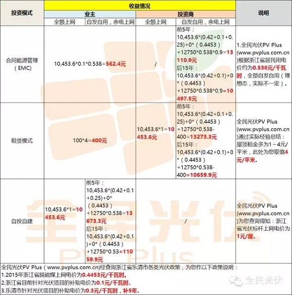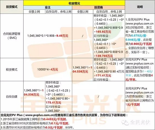 若您家的屋頂面積為100平米(電價可參考上文中2015年浙江電網銷售電價表),則其裝機容量或為10KW,年發電量或為1.045萬度(中間過程取值均為估算值,因此與實際情況或有出入。如需針對具體項目進行精準設計、測算,可聯系全民光伏PVPlus為您提供免費開發顧問服務),則您的收益可能為: