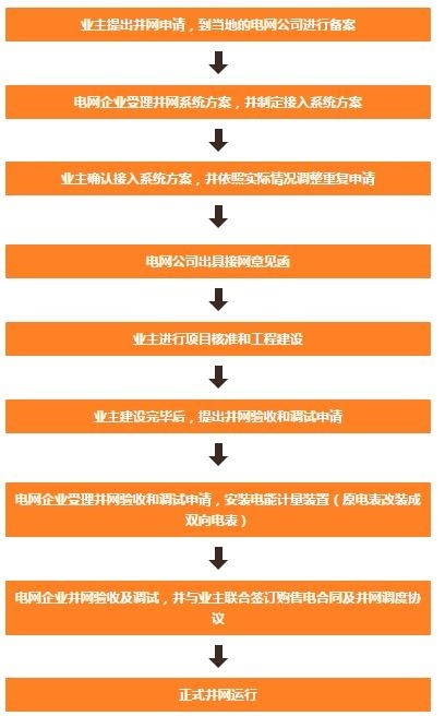 并網申請流程個人用戶需要帶上身份證、戶口本、房產證等相關材料辦理,企業用戶帶上營業執照、法人代表身份證、土地證、房產證、項目材料等相關材料到當地供電營業廳辦理申請
