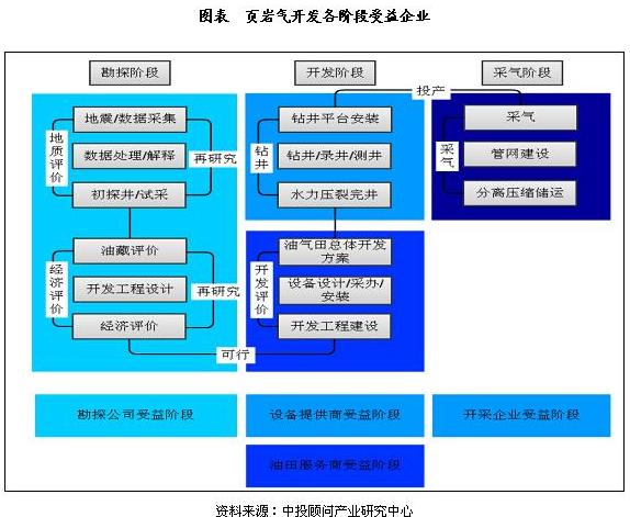 頁巖氣區(qū)塊的開發(fā)流程可劃分為勘探、鉆井和采氣三個階段,產(chǎn)業(yè)鏈中的企業(yè)將在相應(yīng)階段受益。取得探礦權(quán)和采礦權(quán)的油氣企業(yè)將負責(zé)勘探、鉆井、開采、以及儲運銷售油氣資源整個過程的組織工作。但是,由于專業(yè)技術(shù)以及特種設(shè)備需求的原因,頁巖氣區(qū)塊開發(fā)的勘探、開發(fā)設(shè)計、鉆井等工作一般會由油氣企業(yè)外包給勘探公司與油服公司,而特種設(shè)備制造商則在采購鉆井設(shè)備階段進入分利群體。
