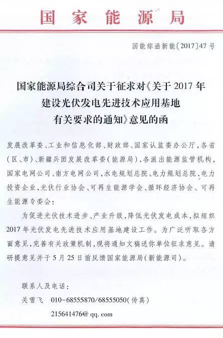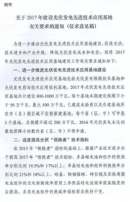 近日,華夏能源網(微信號sinoergy_com)獲悉,國家能源局綜合司發(fā)出了名為《關于2017年建設光伏發(fā)電先進技術應用基地有關要求的通知》的征求意見稿,對光伏發(fā)電先進技術應用基地建設的規(guī)劃、優(yōu)選、評分規(guī)則等做意見征集。