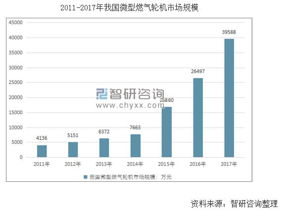 2017年6月,發(fā)改委和能源局聯(lián)合發(fā)布的《依托能源工程推進燃氣輪機創(chuàng)新發(fā)展的若干意見》提出,到2020年,各類中小型燃機自主設計制造體系進一步完善,各類中小型燃氣輪機裝備初步實現(xiàn)系列化,滿足各類能源項目需求。近幾年,我國微型燃氣輪機市場發(fā)展迅猛,2011年我國微型燃氣輪機市場規(guī)模僅4136萬元,到2017年已達到39588萬元,年均復合增長率高達45.71%。按照這個速度發(fā)展,預計到2020年我國微型燃氣輪機市場規(guī)模將超過10億。