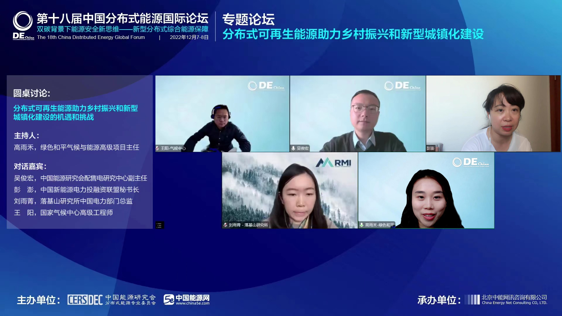 主持人 高雨禾:各位線上的行業(yè)同仁大家上午好!歡迎來到今天的圓桌討論環(huán)節(jié),我是本次環(huán)節(jié)的主持人高雨禾,來自綠色和平氣候與能源項目組。我們今天討論的話題是分布式可再生能源在助力鄉(xiāng)村振興和新型城鎮(zhèn)化建設中面臨的機遇和挑戰(zhàn),我們非常有幸的邀請到4位重量級的嘉賓,也是我們行業(yè)的專家與我們分享他們的真知灼見。分別是來自中國能源研究會配售電中心主任吳俊宏;來自中國新能源電力投融資聯(lián)盟秘書長彭澎;來自落基山研究所中國電力部門總監(jiān)劉雨菁;來自國家氣候中國高級工程師王陽博士;