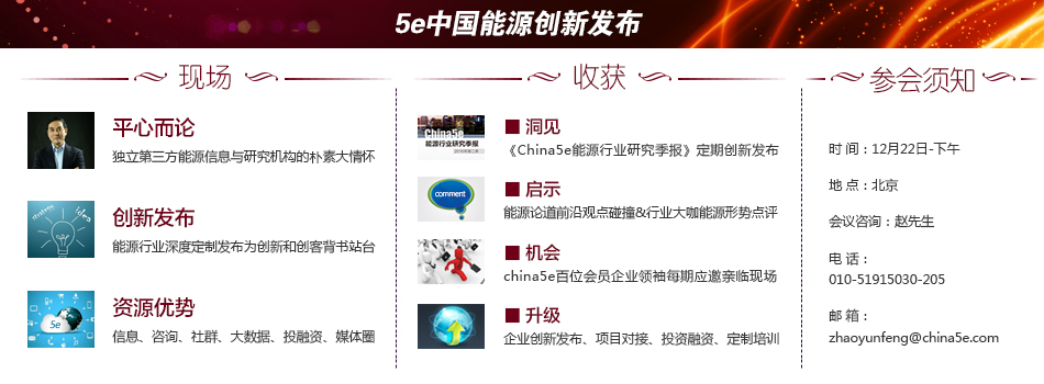 “5e中國能源創新發布”是中國能源網(m.brumoxim.com)整合能源行業十六年會議、咨詢、培訓、社群、數據、投融資和媒體等資源,為能源企業及china5e會員打造的能源領域創新發布與交流平臺。發布會每年舉辦四期,會上將發布《China5e能源行業研究季報》并邀請國內外知名能源專家進行點評。現誠邀能源企業參與發布平臺,提升企業品牌、尋找合作機遇。